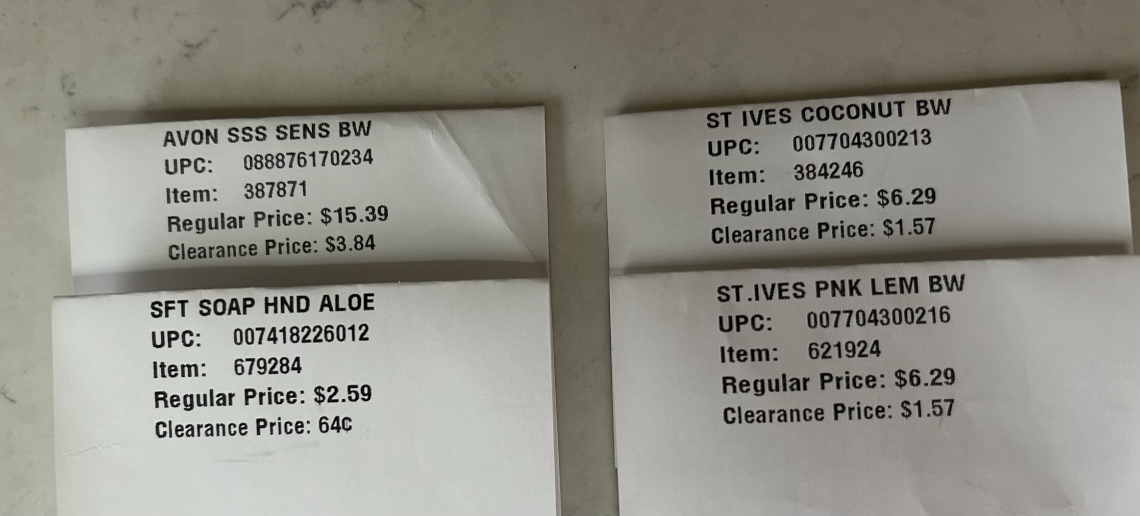 Four printed CVS clearance shelf labels showing discounted prices, including Avon Skin So Soft Sensitive body wash reduced from $15.39 to $3.84, St. Ives body wash varieties reduced from $6.29 to $1.57, and Softsoap aloe hand soap reduced from $2.59 to 64¢.