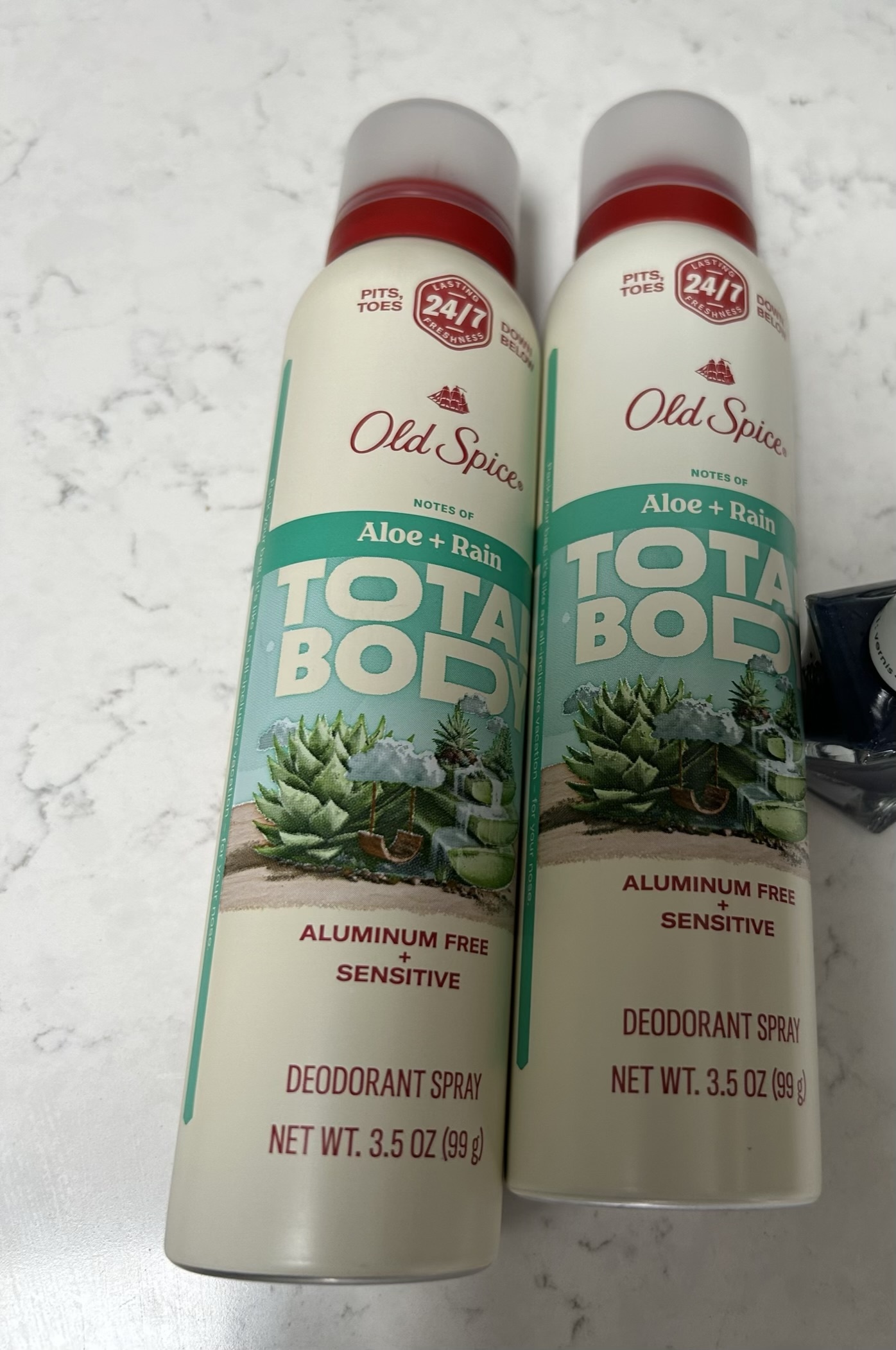 Two Old Spice Total Body deodorant sprays, Aloe + Rain scent, aluminum-free and sensitive formula (3.5 oz each), placed side by side on a light marble surface.